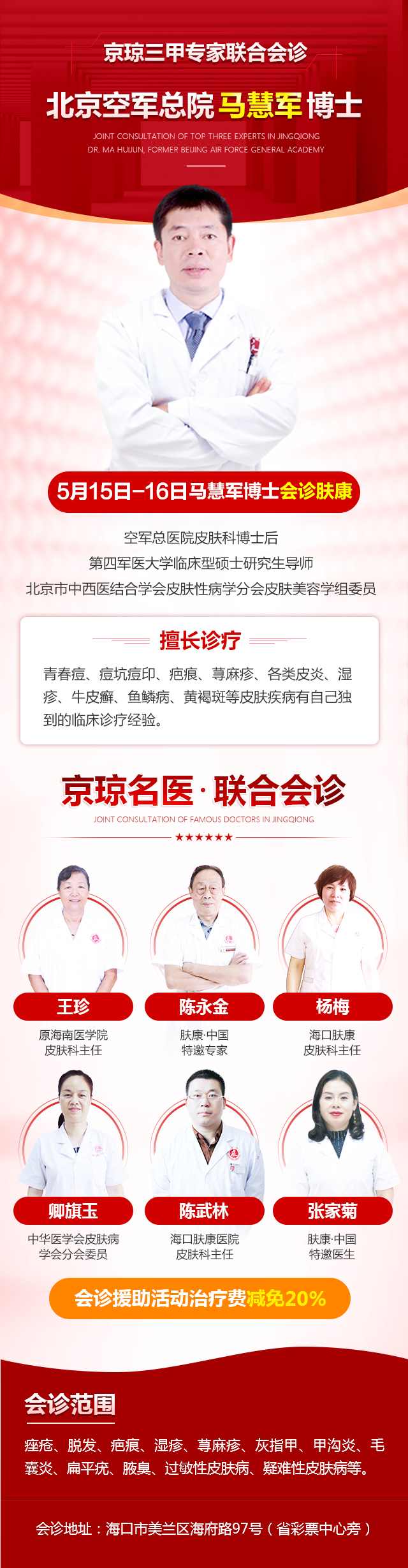 夏季是皮肤病的高发期,很多患者深受其害。皮肤病发作时常常让人坐卧不宁,严重影响工作和生活。为帮助广大患者早日恢复身心健康,5月15日,北京空军总医院皮肤科博士马慧军主任将莅临海口,参加第二届“京琼皮肤科专家会诊周”活动。